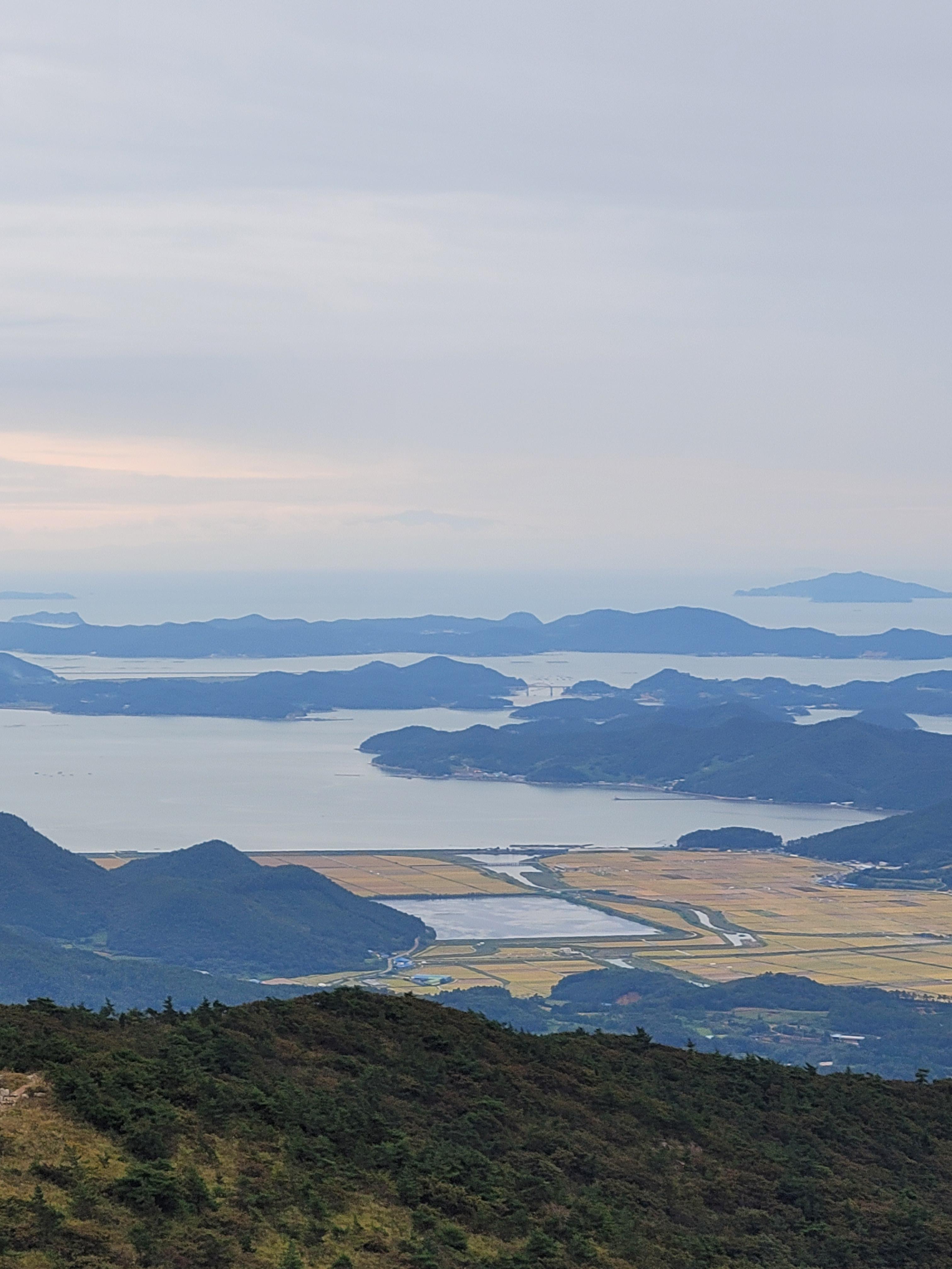 멀리 눈아래로 다도해의 섬들이 길다란 도마뱀 처럼 바다에 누워있다, 참 섬이 많기도 하다!!!