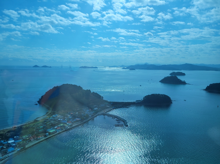 그런테 남산 타워나 부산 타워 처럼 뾰쪽하게 생기지 않았고 마치 큰 오피스 건물 같다. 모두 함께 올라가 보니 전망이 끝내준다. 멀리 저도, 거제도, 거가대교가 한눈에 든다. 바로 아래 보이는 우도로 연결된 다리로 사람들이 평화롭게 오가는 모습이 보인다, 우리도 내려가 우도로 향했다.