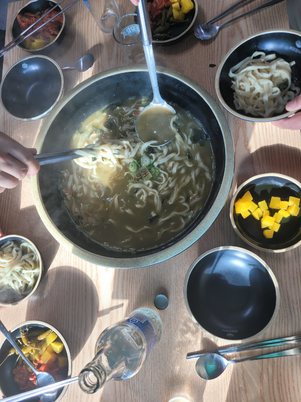해양 테마공원을 지나 국도를 타고 한 삼십분 북동진하면 삼포항이 있다. 이 마을 뒷쪽에 삼포 노래비가 있다는데 금강산도 식후경이라 우선 맛집을 찾았다. 제법 유명하여 줄서서 먹는다는 배말칼국수집이 있다. 우리는 일곱그릇을 원했는데 큰 사발에 3인분, 4인분 두 테이블로 나눠준다, 각자 앞접시에 덜어 먹으라는 뜻이란다.