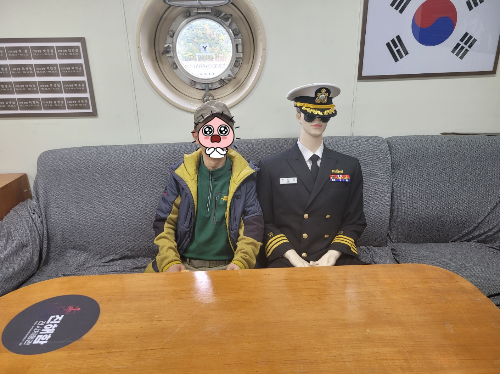 우도엔 별로 볼 건 없었다, 낚시꾼들이 방파제에 늘어 앉아 한가롭게 낚시를 하고 있다 .우리는 용지도로 돌아오는 길에 해양테마공원에 있는 군합을 구경하였다. 건조된지 30년이 넘었지만 아직 바다에 띄워놓으면 얼마든지 항해 가능할 것처럼 단단해 보였다. 함장실이며 수병들의 침실 식장등이 우리 육지엣 것 보다 좁다.함장과 사진 한장 기념으로 남겼다.