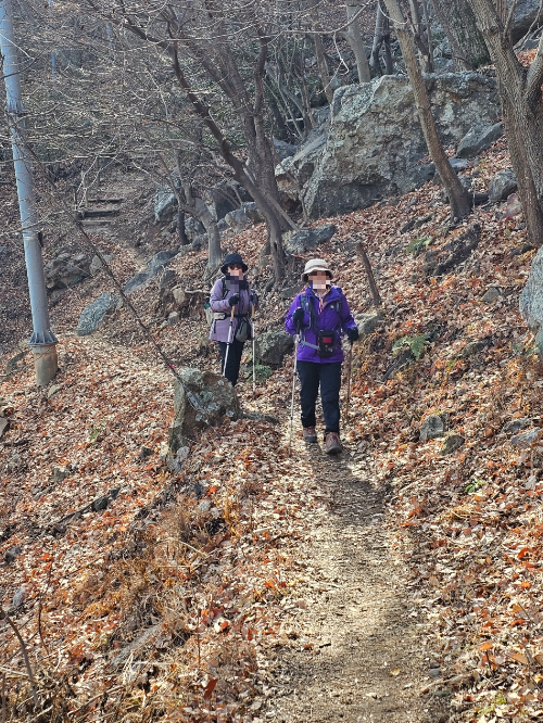 내려오는 길은 조금 가파른 시멘트길인데 모두 뒷걸음질로 내려왔습니다. 등산 막바지에 이렇게 걸으면 다리의 피로가 풀리면서 시원하답니다.