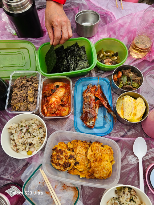 조금 이른 시각이지만 산 정상의 데크에 모여 모두 맛있는 점심식사를 합니다. 저녁에 맛있는걸 먹으려면 좀 일찌기 밥을 먹는게 좋겠다는 어느 한 사람의 말도 안돼는 논리에도 모두 별 말 없이 도시락을 풀어 놓네요..ㅎ 갖가지 도시락을 펼쳐 놓으니 부페가 따로 없습니다. 이런 저런 얘기꽃도 피워가며 언제나 식사는 즐겁습니다.