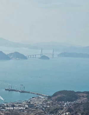 멀리 거가대교가 흐린 날씨 속에 아련하게 보이고, 돌아다보니 남쪽으로 국수봉이 펼쳐집니다, 저기가 새 공항이 들어설 자리인가 봅니다. 산을 온통 갂아내고 바다를 메워 공항을 만든다니 정말 어마어마한 공사가 되겠네요.