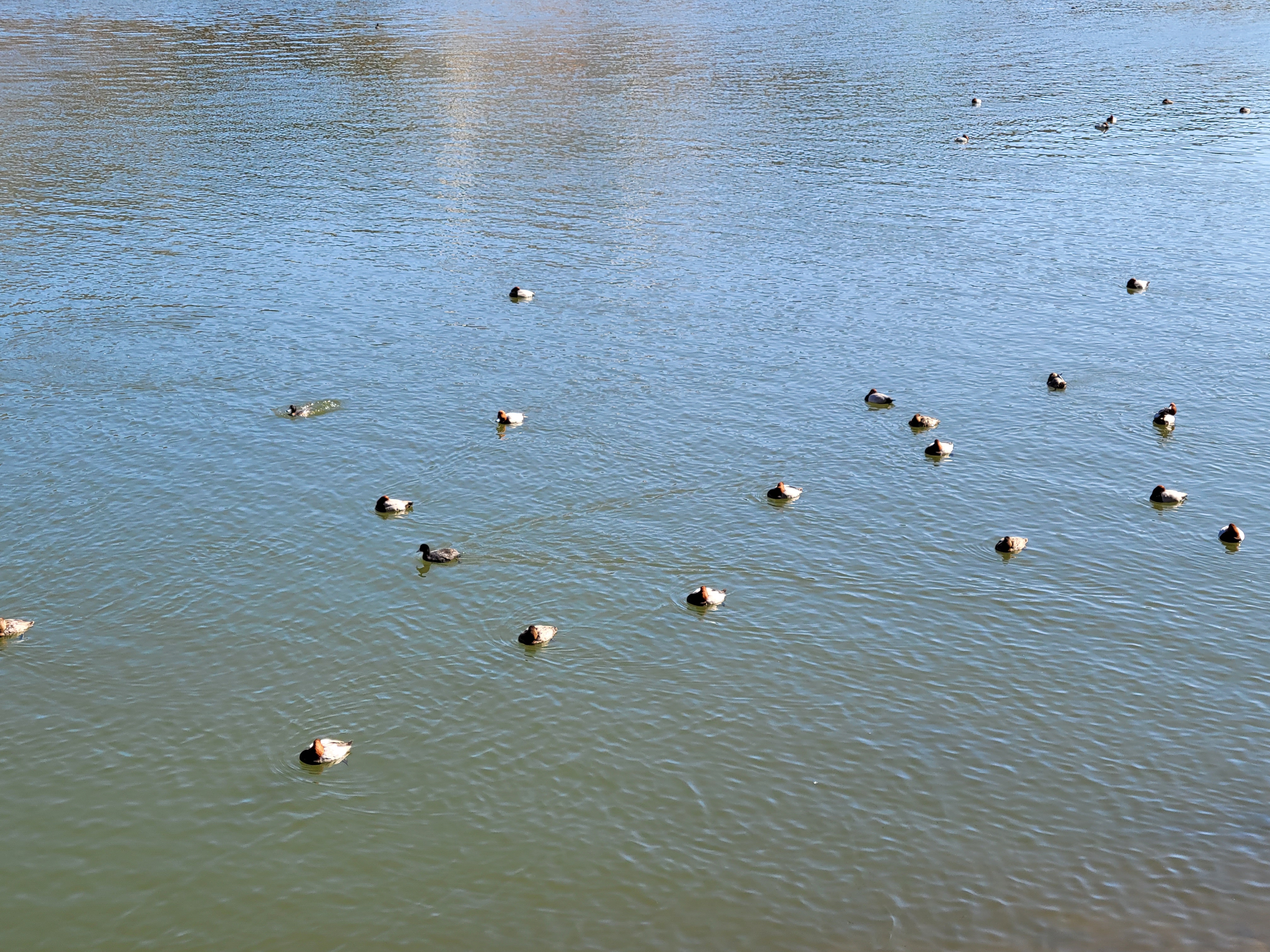 좀 더 가니 날개죽지가 흰 오리 종류의 철새가 모여 쉬고 있네요, 쉴 때는 날개쭉지 위에 부리를 얹어 놓고 졸 듯이 물위에 떠있습니다. 한가로운 일요일 풍경입니다.