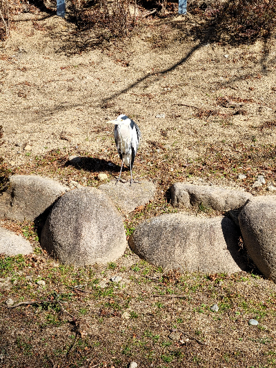 토곡 쯤 가니 두루미 한마리가 마른 둑 기슭에서 햇볕을 쬐며 서있습니다.