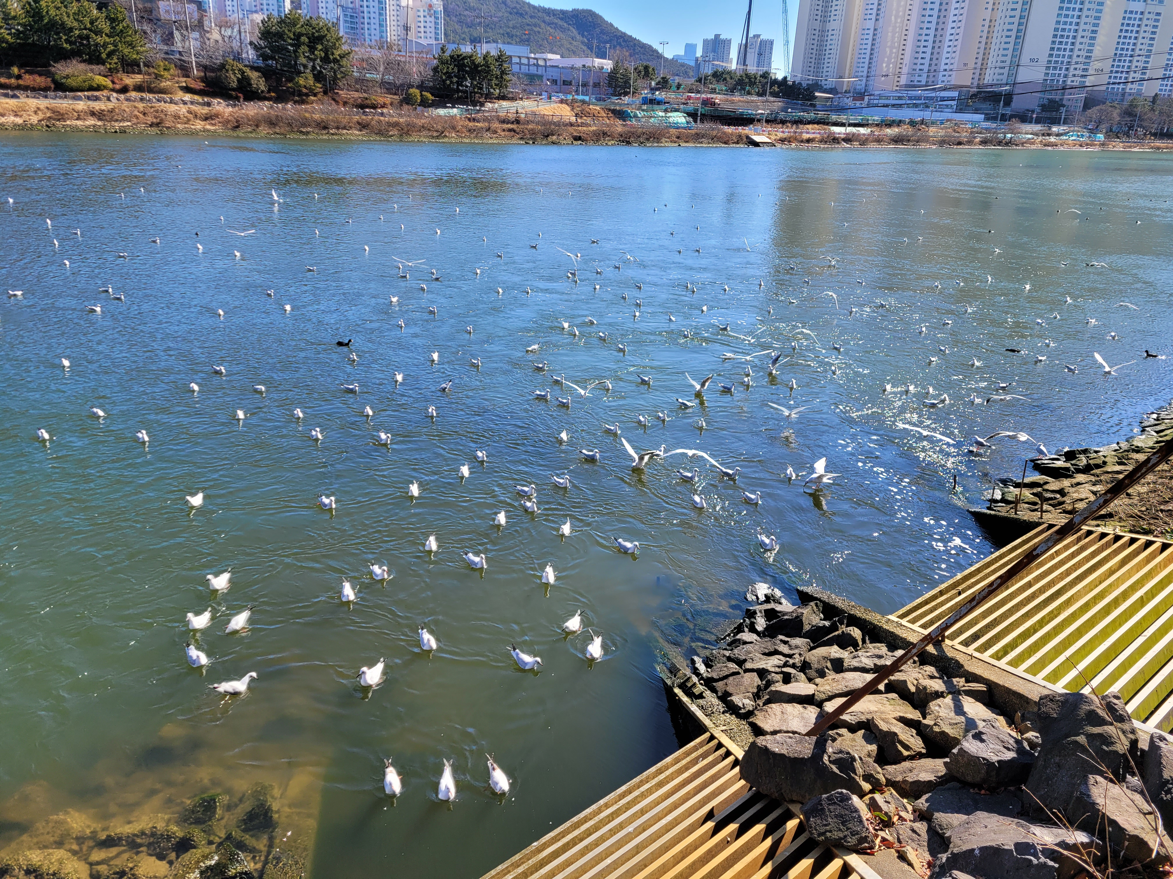 갈매기 떼가 분주하게 모여 먹이 활동을 하는 게 보입니다. 간혹 검정 오리 같이 생긴 새들도 섞여 있는데 서로 해코지를 않는 걸 보니 얘들은 흑백 다툼은 없나 봅니다.