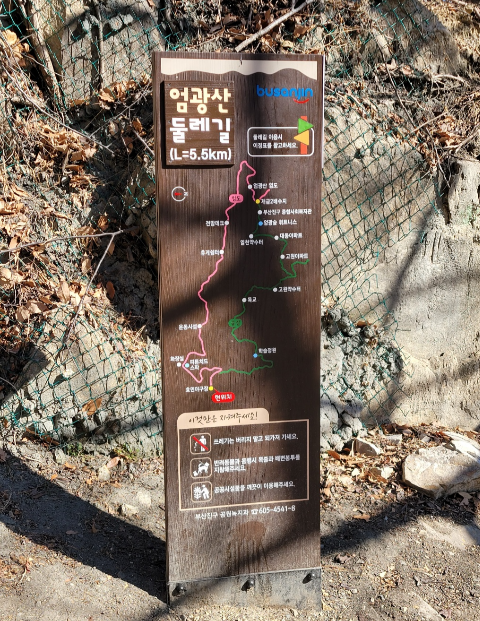부산 한 가운데 있는 엄관산 둘렛길을 친구들과 다녀왔습니다.지하철 동의대역 5번 출구를 나오면 동의대 셔틀버스가 있어요.일요일은 학생들은 없고 우리같은 등산객들이 주로 이용하는군요. 버스를 타고 한 5분~10분 올라가면 캠퍼스 윗쪽에 회차공간이 있는 삼거리가나옵니다.여기서 모두 내려 산행을 시작합니다.날씨는 늦추위에 부는 바람이 쌀쌀하게 뺨에 와 닿습니다.서둘러 목도리를 꺼내 한바퀴 휘익 감습니다.맨 꼭대기에 동의대 야구장이 있고 여기를 지나치면 등산로 입구가 나옵니다.이정표와 등산로 안내판이 있긴 한데 우리는 아마도 이 지도대로 가진 않을 예정입니다.엄관산 등산로는 너무나 복잡하게 얽혀있어 자칫 길을 잃을 수도 있지만, 거꾸로 생각하면 조금 잘못 들었더라도 곧 또다른 길을 따라 원래 예정대로 돌아오기도..